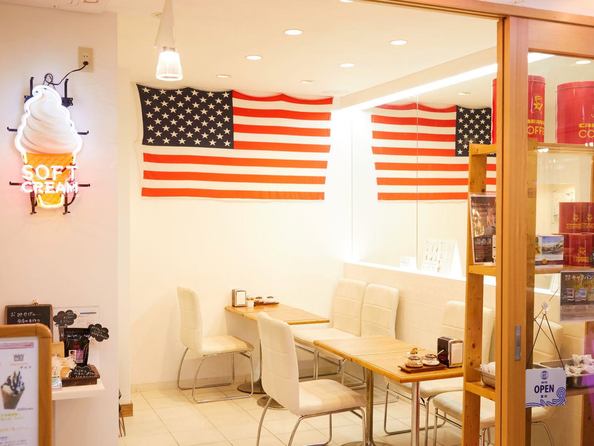 ソフトクリームのネオンサインと星条旗がポイントの店内。ゆったり過ごせるイートインスペースもあります。
