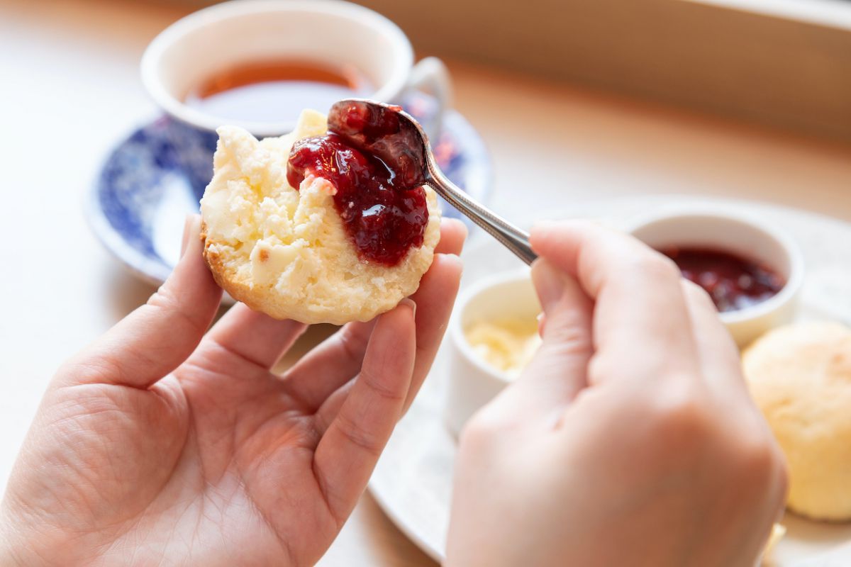スコーンは半分に割って、クロテッドクリームとジャムを塗るのが本場の食べ方。