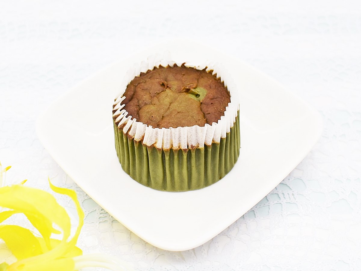 鮮やかな緑が目を惹くパッケージを開けると、手のひらサイズのバスチーが登場しました。丸いフォルムがかわいくて心が踊りますね。美しい抹茶色の生地には、しっかりとした焼き色がついています。