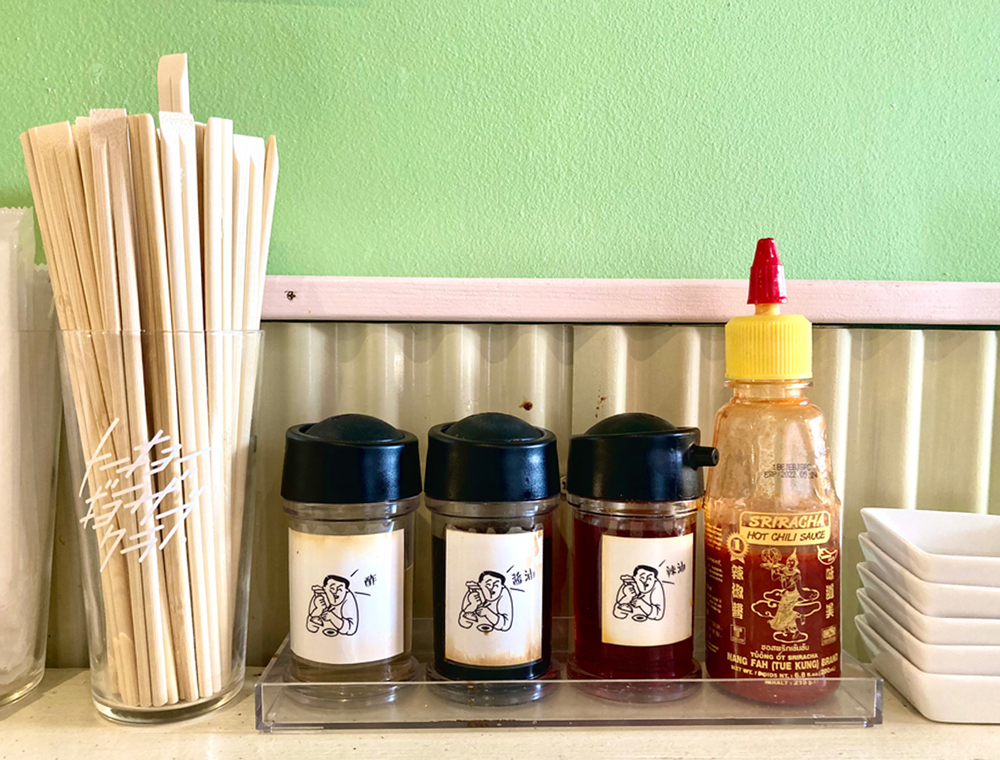 席にはお酢、辣油、醤油などの調味料が並びます。右にある赤いシラチャー(スイートチリソース)は、お店おすすめの味変アイテム!
