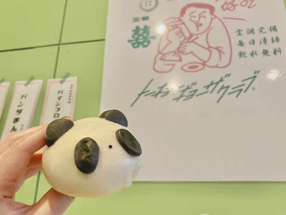 「パンダまん」の中には優しい甘さの黒ごまあんが。耳と目の生地には竹炭が練りこまれています。