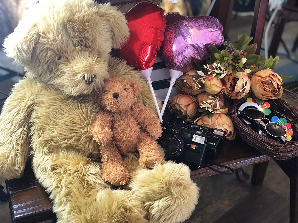 いろいろな種類の椅子やベンチが用意されている上、サングラスやテディベア、フィルムカメラ、お花、洋書などの小道具を使いながらおしゃれなポーズを模索!