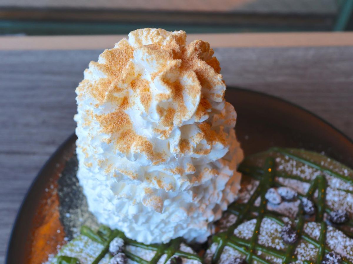 ホイップの上には、香ばしくてやさしい甘さのきな粉がたっぷり。抹茶のパンケーキと一緒に食べるとよりいっそう和テイストな味わいを堪能することができますよ。ホイップクリームはのっていませんが、「宇治抹茶パンケーキ(黒みつ&きなこ)」730円(テイクアウト)はお持ち帰りもOK。気になる方はぜひ食べてみてください。