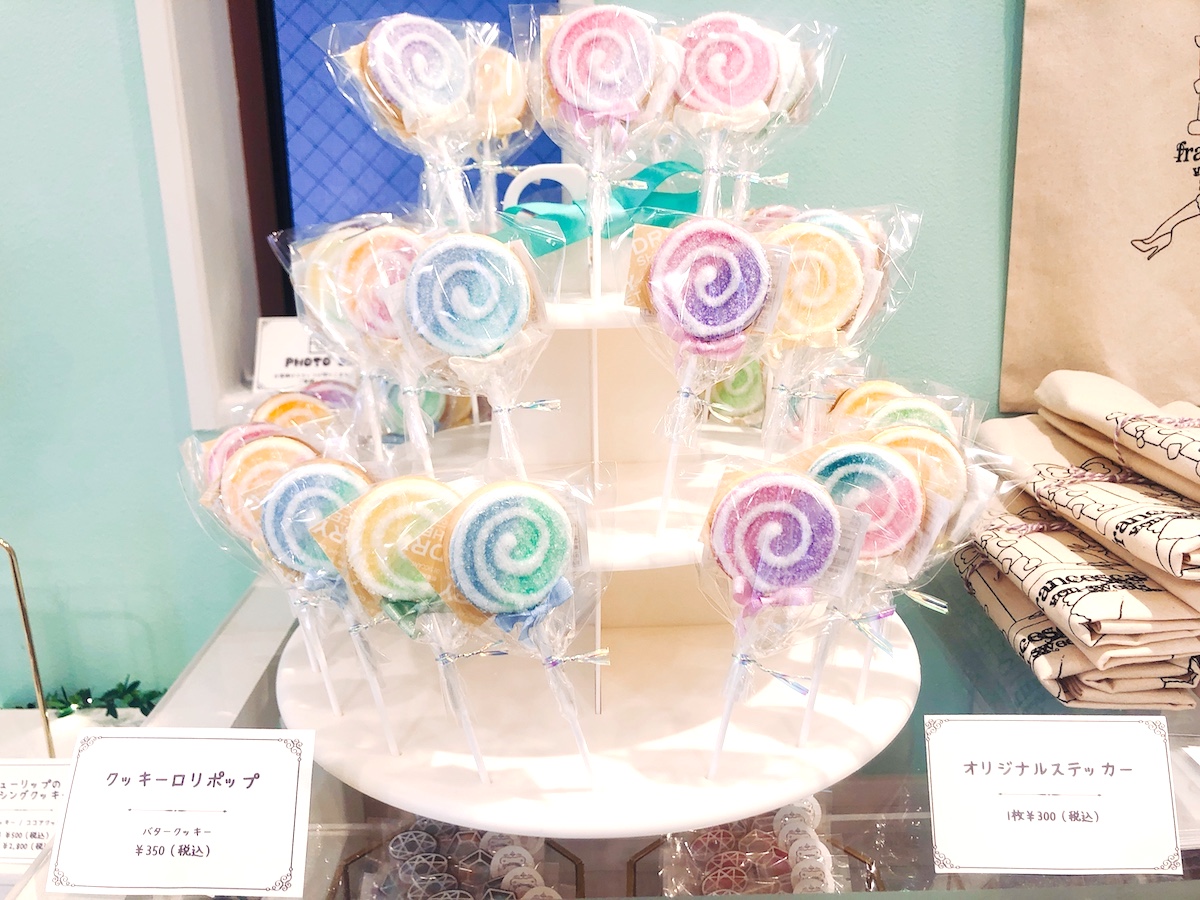 キャンディーかと思いきや実はこちらもクッキーなんです。「クッキーロリポップ」350円(税込)はお友達と色違いで持ったら写真映えすること間違いなし!トッピングのシャリッとしたお砂糖がおいしい、甘党におすすめのクッキーです。
