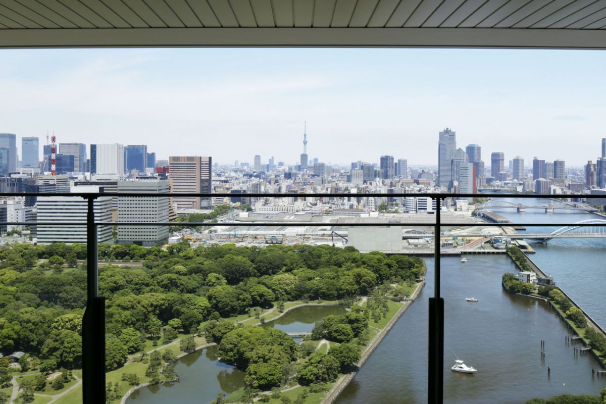 浜離宮恩賜庭園側の客室はガーデンビューとなっており、全室バルコニーつき。心地よい風を感じながら水と緑に囲まれた空間を独り占めできちゃいます。写真奥には、東京スカイツリーも!きれいな夜景も期待できますね。