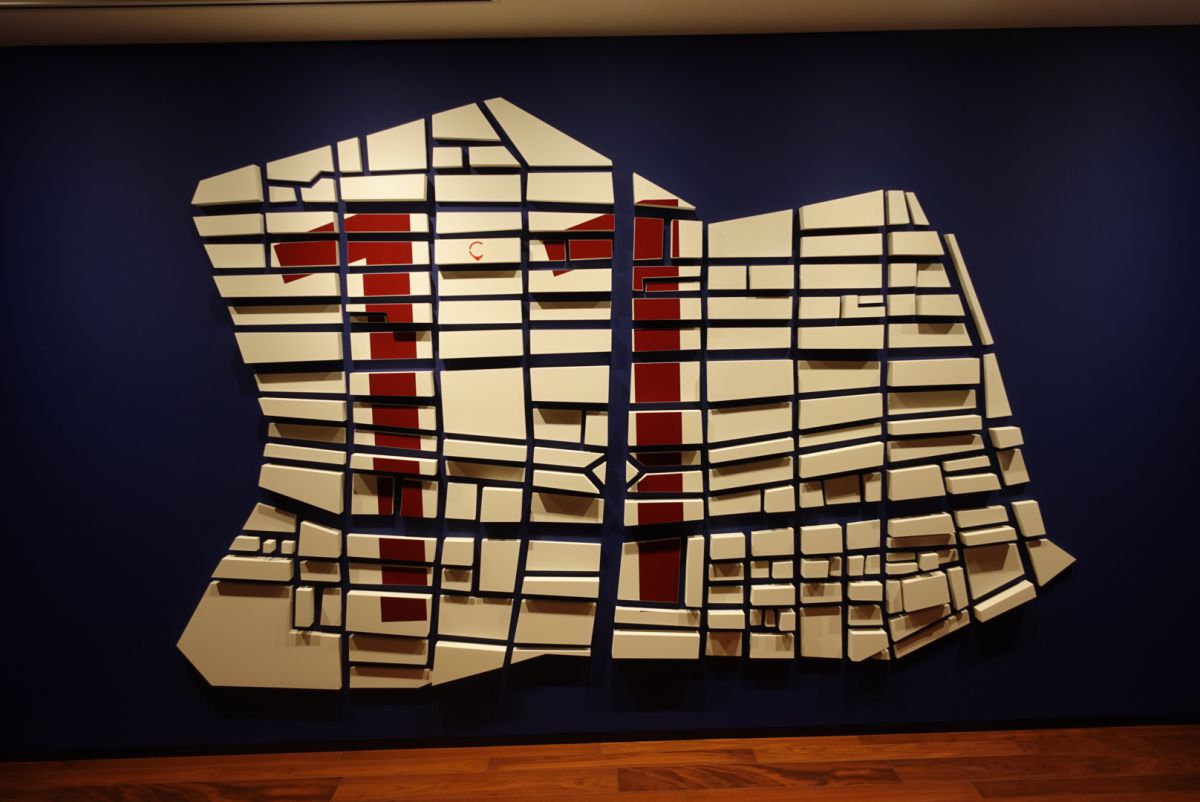 例えば、こちらは私が泊まった階のエレベーターホール。よく見ると「C」のホテルのマークが入っていて…そうこれは、銀座の地図なのです!色合いもレトロで可愛いですよね。