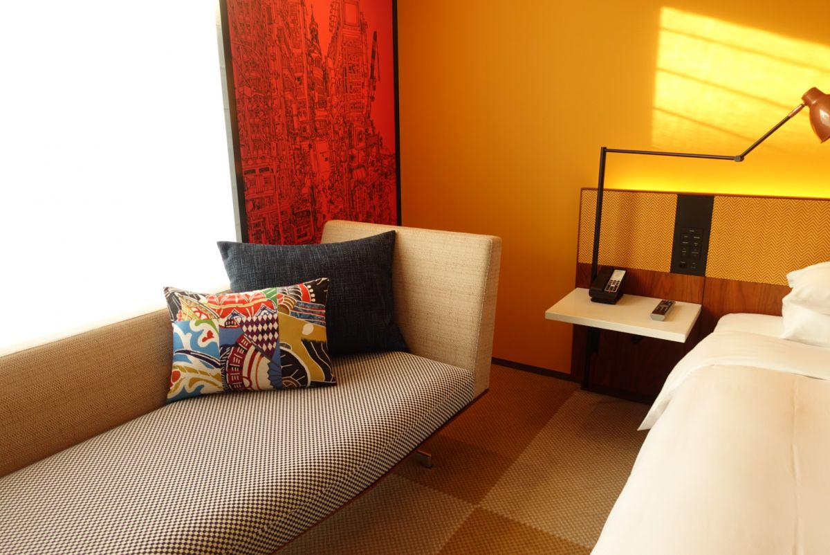 そして、お部屋。こちらは「キング」タイプのお部屋なんですが、もうこの黄色の壁、赤の襖、ランプ、クッション、床の市松模様のデザインと…ハイカラな、古き良き銀座の空気が感じられて、気分が上がります!