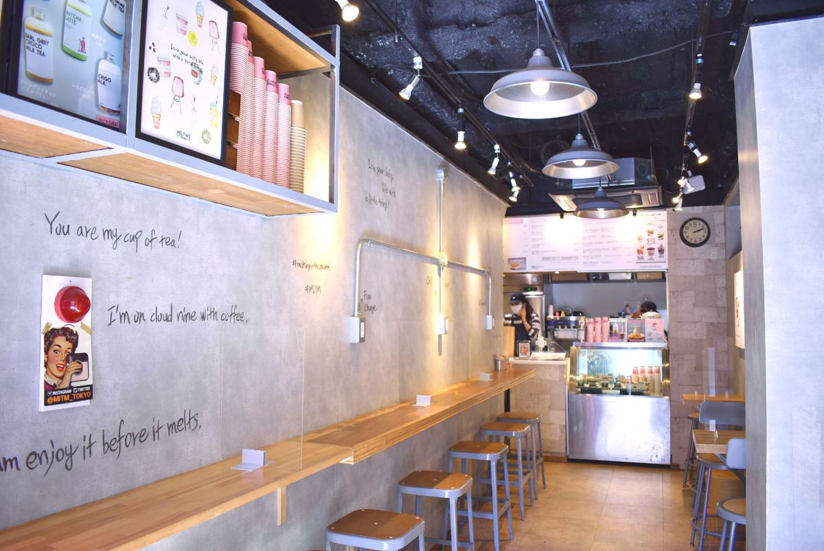 広尾駅から徒歩4分のところにある「Melting in the mouth」は、モノトーンをベースに、ピンクのアクセントが利いたおしゃれなカフェ。おもちゃのようにぷっくりモコモコとしたフォルムがかわいい“ソフトクリーム”が名物です。