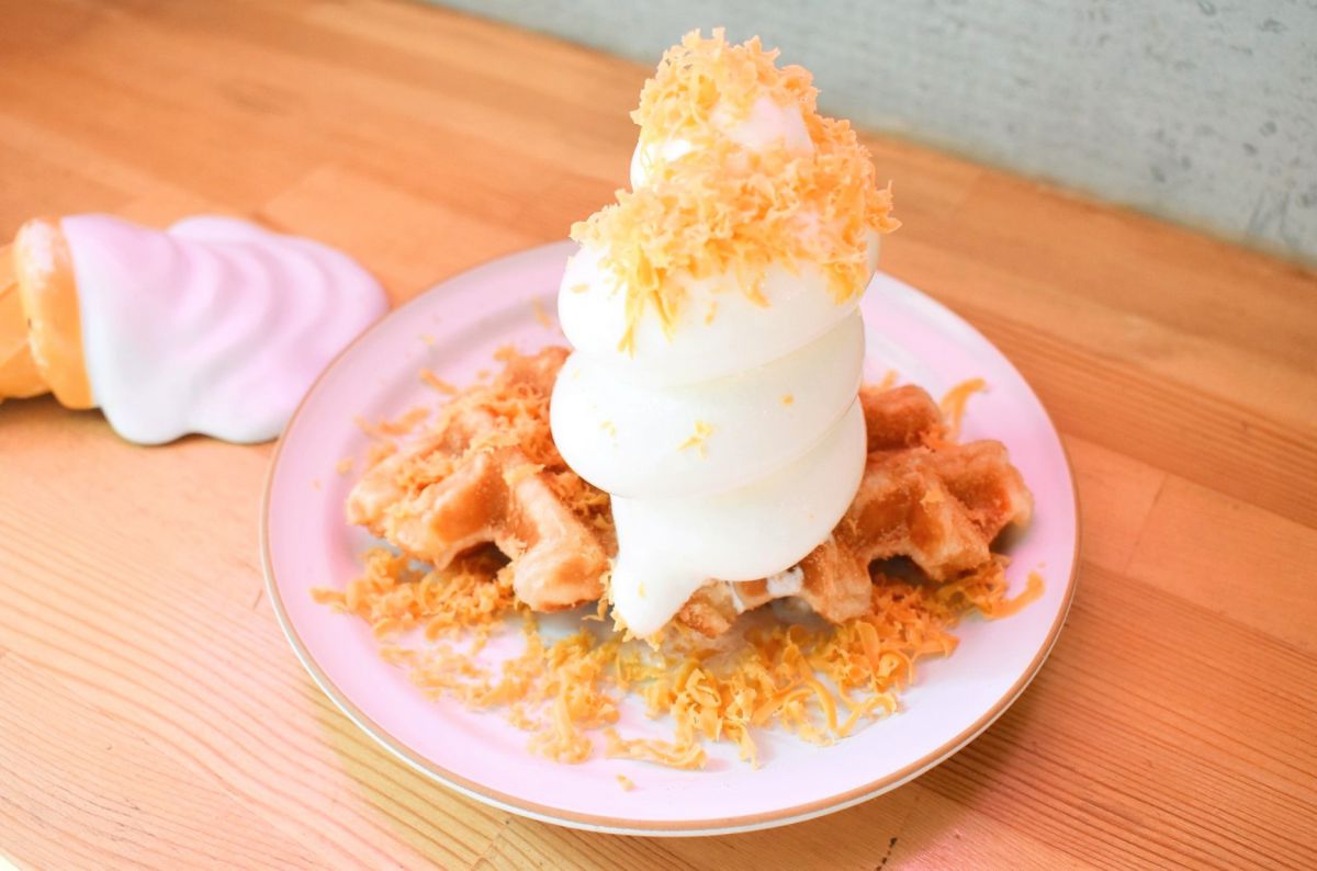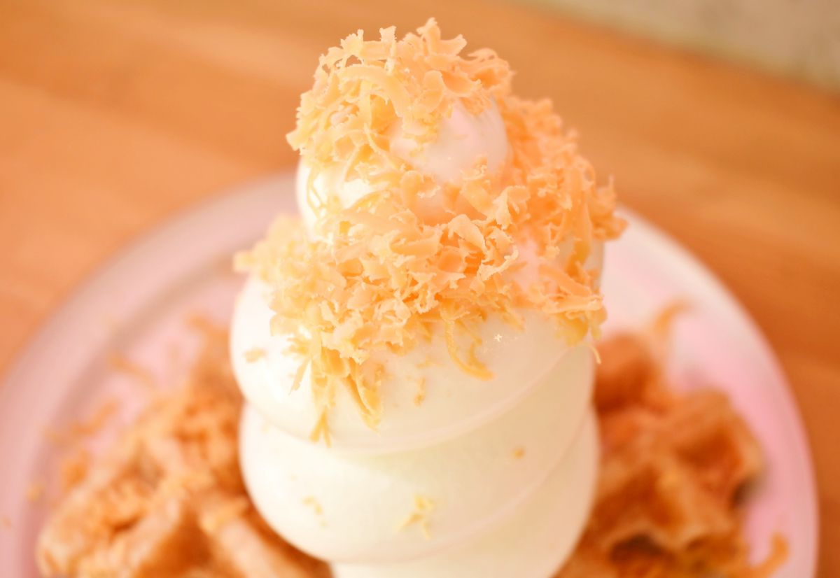 「Melting in the mouth」のクロッフルは、ソフトクリームとブラウンチーズがたっぷりトッピングされていて、インパクト大のビジュアル! しかし驚くべきは、このビジュアルに負けないほど、味がとってもおいしいということなのです。