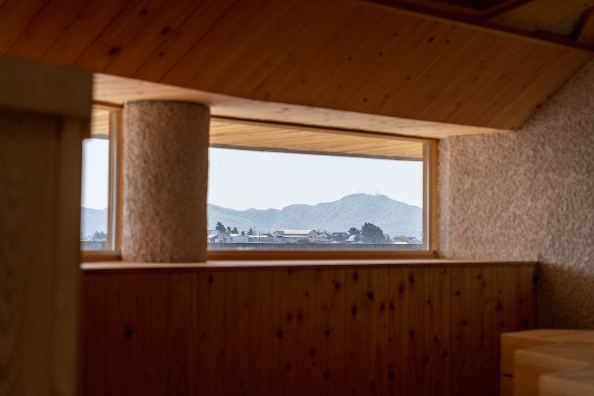坂氏の建築のアイコンでもある、紙管を模したベンチが特徴的な女性用サウナ。こちらには、さくらんぼやラ・フランスなど、山形県産の果樹で製作したウォーリュ(ウォール(壁)でロウリュすること)が設置されています。
