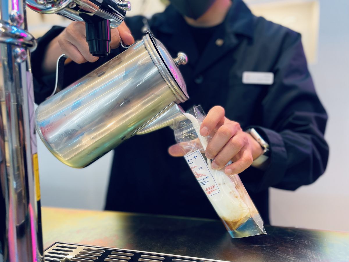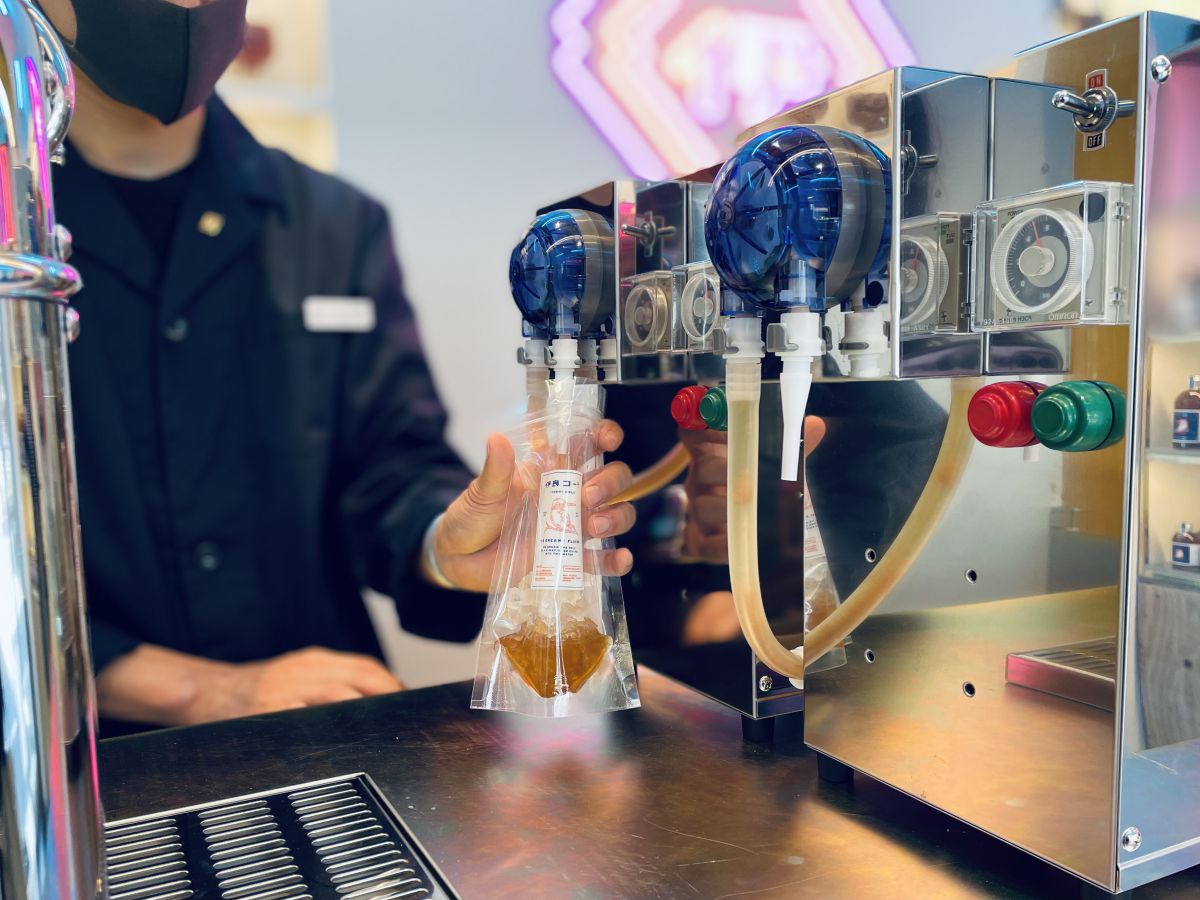 さっそくドリンクをオーダー。今回はコーラ×ミルクが斬新な「MILKOLA®」を注文しました。注文が入ると、パウチにシロップをそそぎ…