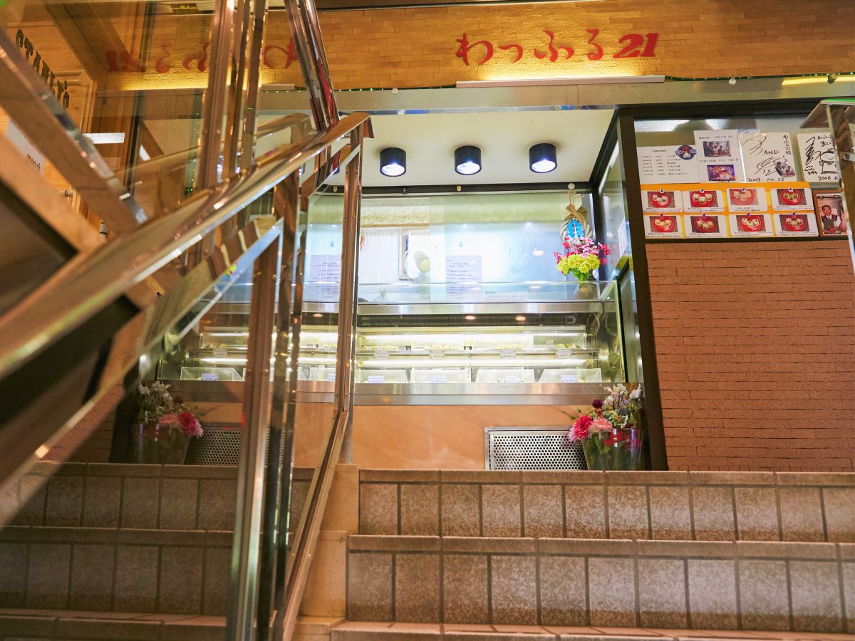 エントランスを奥へと進み、突き当りの階段をのぼるとその正面に「わっふる21」が。テイクアウト専門店ですが、店舗の隣に用意されたイスに座って食べることもできますよ。