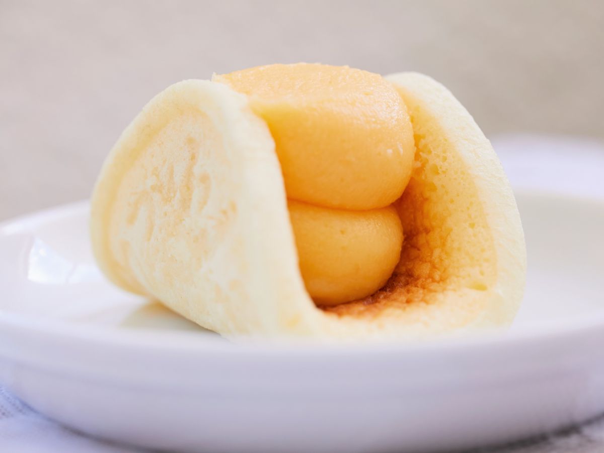 「わっふる21」のワッフルは、楕円形に焼いたやわらかいスポンジ生地にカスタードクリームをのせて、ふんわりと柏餅のように挟んだもの。ワッフルといえば“ベルギーワッフル”を思い浮かべる人も多いと思いますが、実はこれ、明治時代に日本で広まったワッフルを踏襲したものなのだそう。“日本風ワッフル”ともよばれていて、ふわふわと軽いくちどけが特徴なんです。