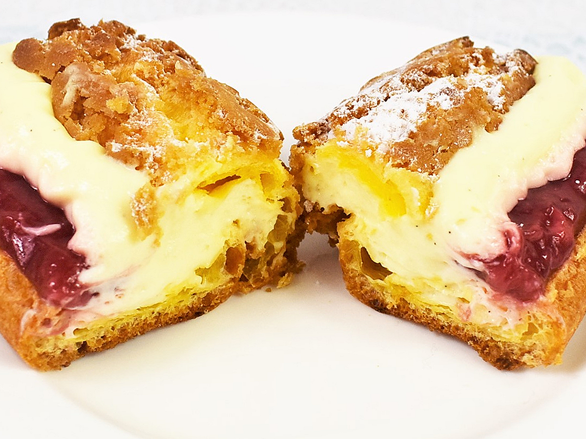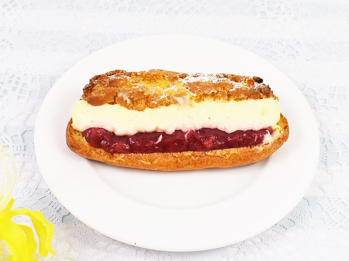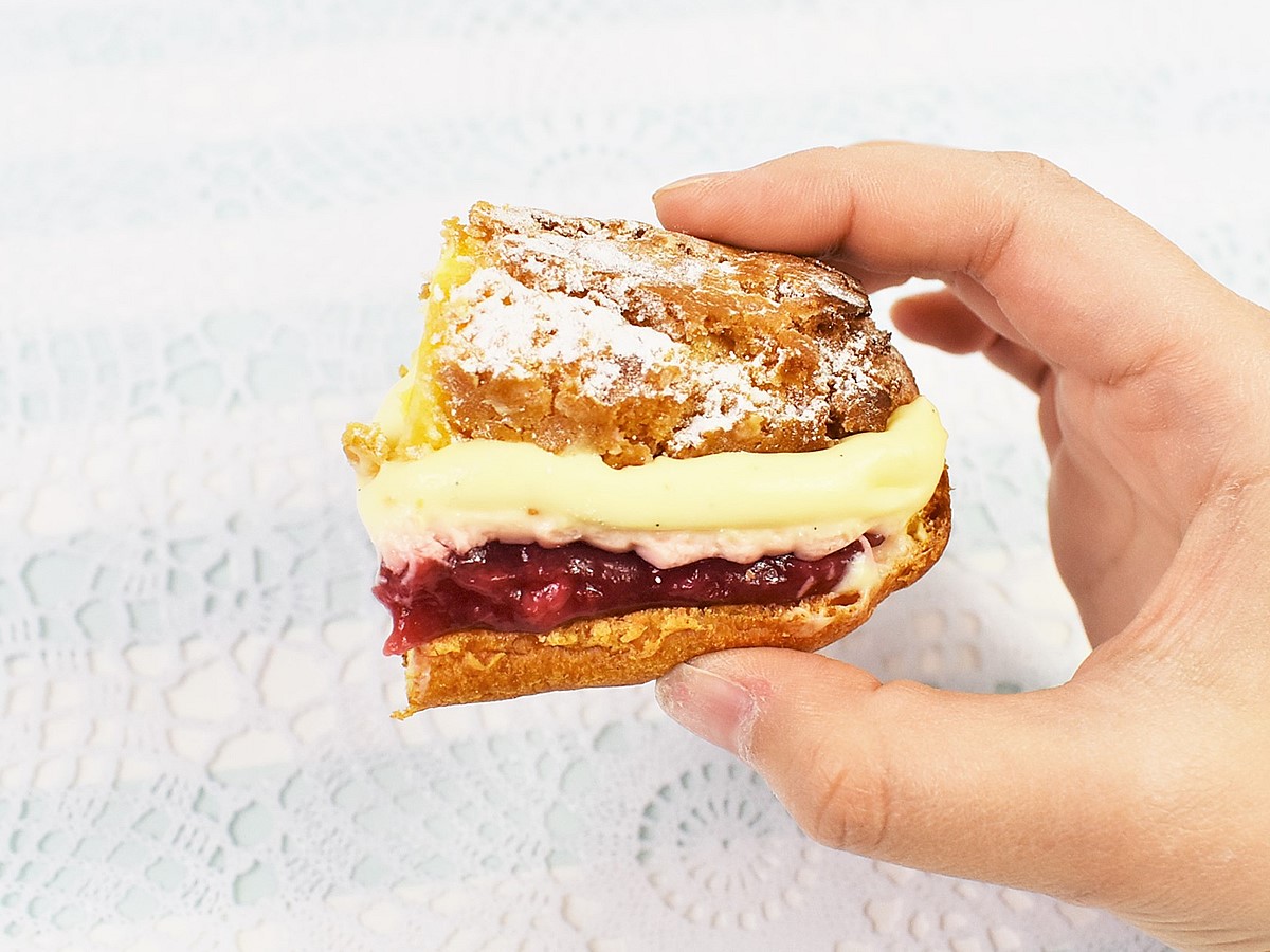 一口頬張ると、口の中に広がるクリームの上品な甘みに感動。生地の端から端まで、こぼれそうなほど入っているクリームを堪能できます。カスタードベースのバニラクリームは、バニラの風味が濃厚で甘さもしっかり。酸味の強いストロベリーソースが味を引き締めてくれるおかげでクドさもありません。
