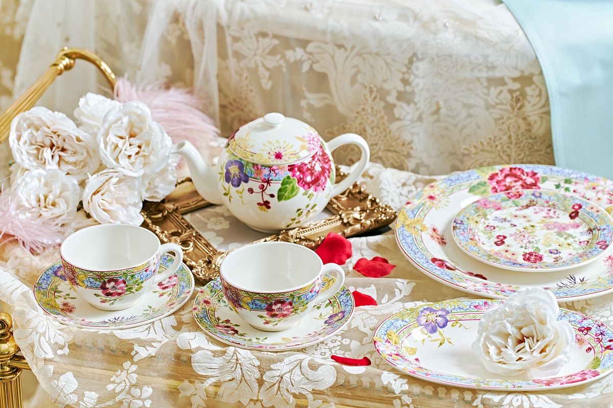 さらに!今年創業200年になる、歴史的・文化的にフランスを代表する一流のテーブルウェアブランド「ジアン」のフローラル コレクションから「ミルフルール」のティーアイテムを展示し、優雅で華やかなお茶会を演出してくれています。