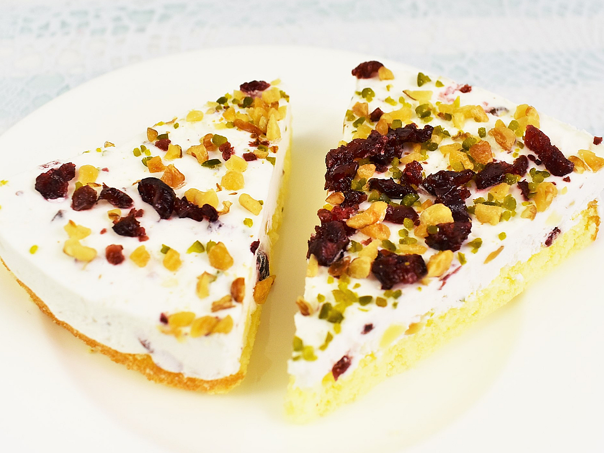 今回の一品はチーズクリームの上にドライフルーツとナッツがトッピングされており、見た目も華やか。凍ったまま食べられる商品なので、冷凍庫で十分に冷やしてから解凍せずにいただいてみましょう。