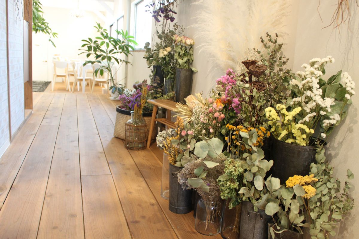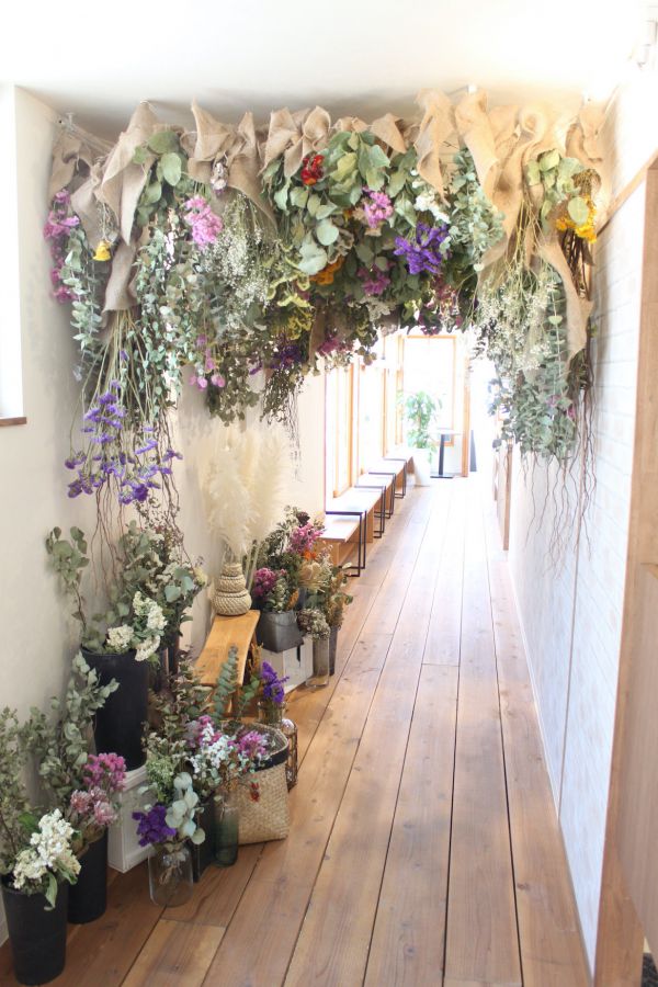 奥のカフェスペースへとつながる、ドライフラワーのトンネルはフォトジェニックなスポット!ちょっぴりラグジュアリーな気分になれそうですね。