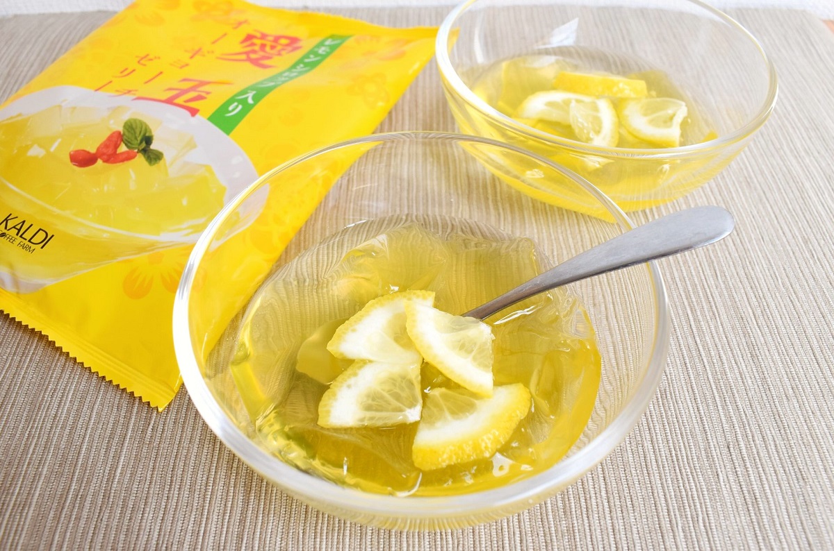 器に盛ってみると、ぷるんとしたゼリーは透明感があり涼やか。食べてみると、つるんとした舌ざわりでやわらかく、のど越しが最高です! レモンシロップの爽やかな甘酸っぱさもきいていて、暑い日にもさっぱりといただけますよ。