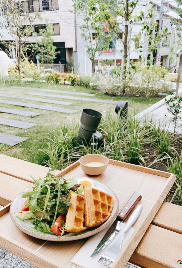 そんな贅沢な空間で、まずは渋谷カフェの限定メニュー「ブランチプレート」935円(税込)を注文してみました。料理家の副島モウさんが監修したこだわりの一品。甘くないお食事系ワッフルが2枚と、たっぷりお野菜がこんもりとのっています。