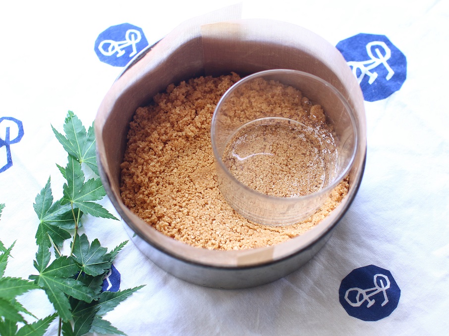 ②を丸型に入れ、底が平らなグラスなどで、まんべんなく押さえつけて固めます。