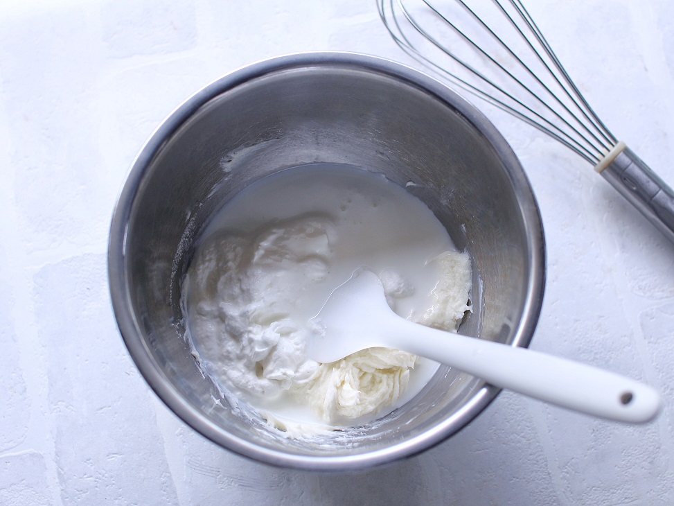 生クリームを入れたあとは、泡立て器に持ち替えても大丈夫です。