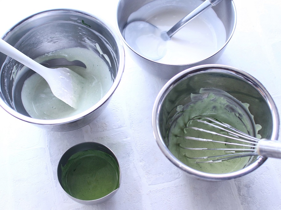 チーズ生地が一番多いボウルには抹茶を加えず、そのまま使います。