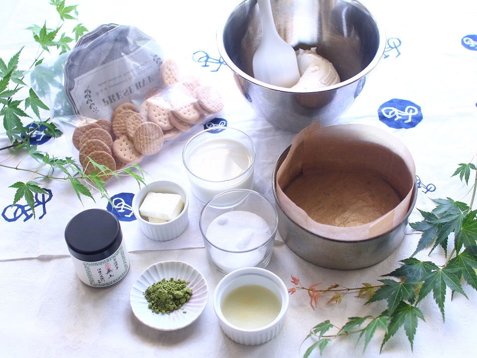 | 【底生地部分】 市販のビスケット…100g 無塩バター…50g 【レアチーズ部分】 クリームチーズ…200g グラニュー糖…80g ヨーグルト…200g 生クリーム…200g 粉ゼラチン…5g 水…25ml 抹茶…5g お湯…25ml |