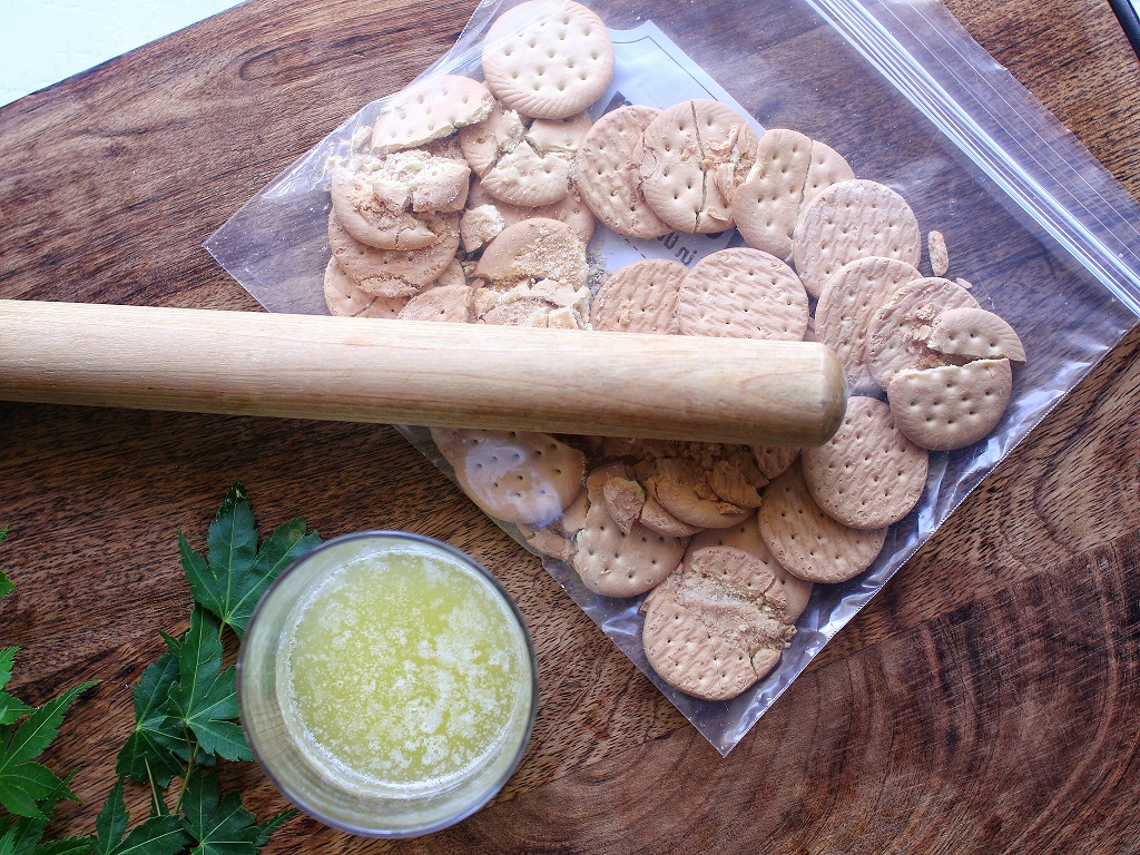 ビニール袋にビスケットを入れ、麺棒で細かく砕きます。
