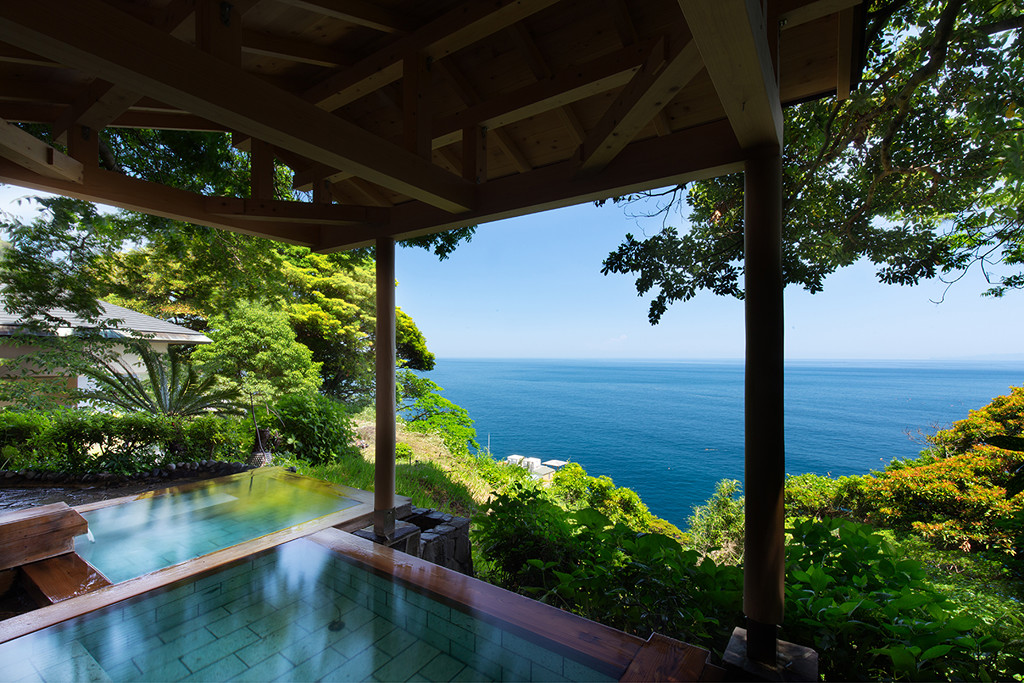露天風呂「碧海」からは眼下に相模湾、伊豆大島を眺められます。開放感あふれるインフィニティ仕様で、まるで海に浸っているかのような気持ちになれるでしょう。檜風呂なので、景色とともに香りも存分に味わって。