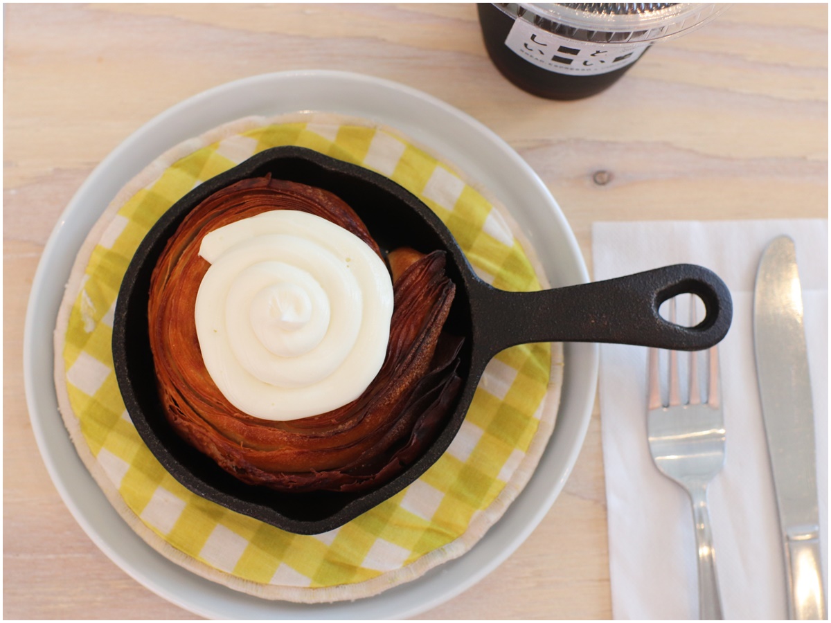こちらの大人気メニューがこの「クロワッサンシナモンロール」。なんと、オーダーごとに1つずつ焼き上げてくれるんです!イートイン限定で提供されていて、週末にはこれを目当てに訪れる人がいるほど大人気。