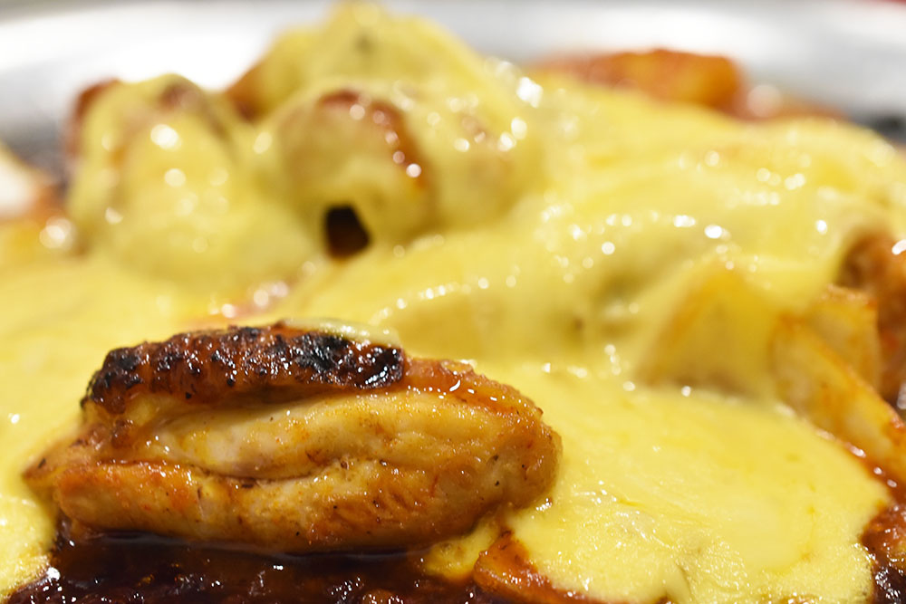 甘辛く炒めた鶏肉にとろけたチーズを豪快にかけて…