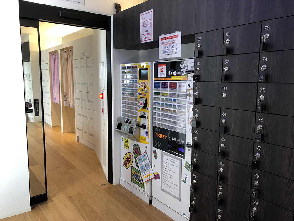 券売機では、入浴料 90分(大人480円ほか)やサウナ 120分(450円・バスタオルセット付き)などの利用券に加え、1回分入りのスキンケアアイテム(各50円)、ヘアゴム(40円)、白フェイスタオル(100円)やあかすりタオル(300円)まで、必要なものが安価で購入できます。手ぶらできても安心ですね!