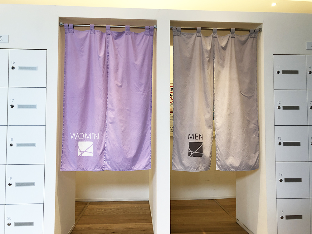 男湯と女湯の入り口には、グレーとパープルの暖簾が。