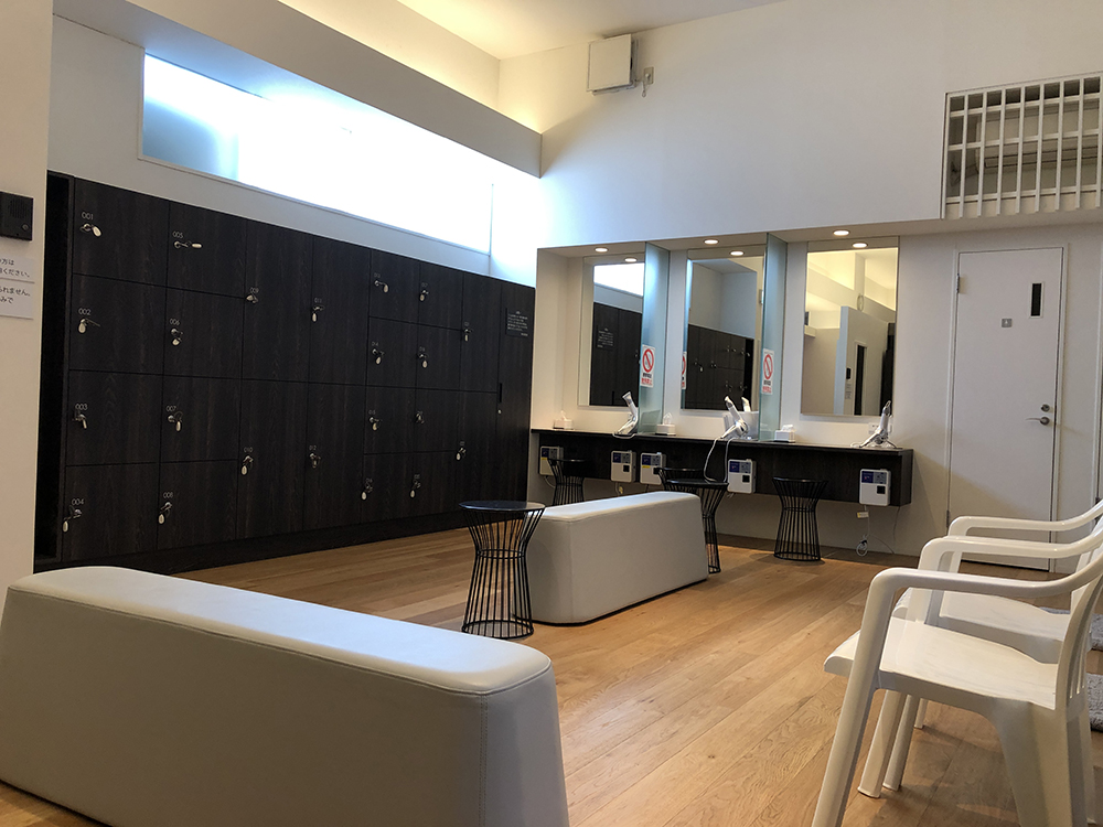 こちらが女湯の脱衣所。ブラックをアクセントにモダンだけど決して無機質な感じではなく、フローリングの床があたたかみを加えています。