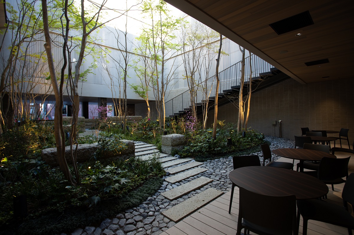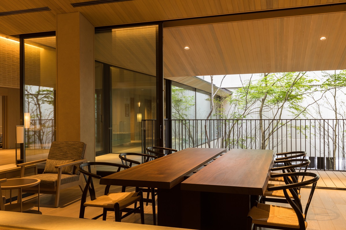 木のぬくもりを感じさせるロビーは、外の景色と室内の境を曖昧にし、自然との調和を生み出す、日本建築独特の空間“縁側”のエッセンスが取り入れられています。四季を感じさせるモミジやカエデなどの豊かな植栽の中庭と一体となった空間が素敵です。
