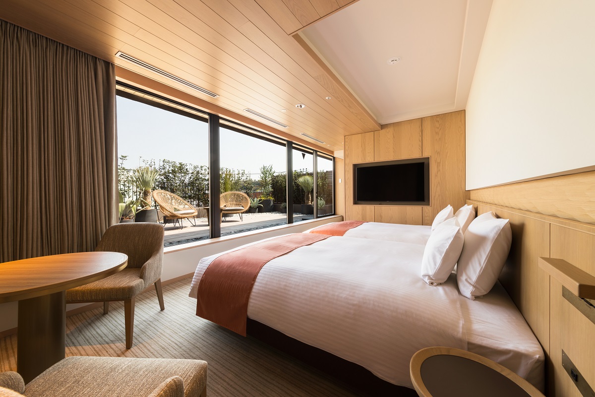 開放的な大きな窓と屋外テラスがついた、プライベート空間を楽しめる1室限定のガーデンツイン。