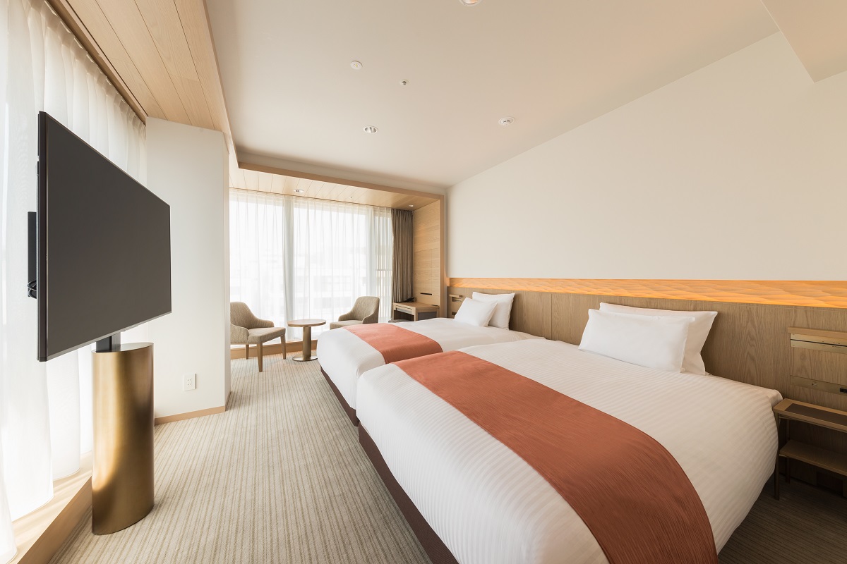 140cm幅のダブルサイズベッドを2台配置し、大きな窓から明るい太陽の光が射し込むコーナーツイン。