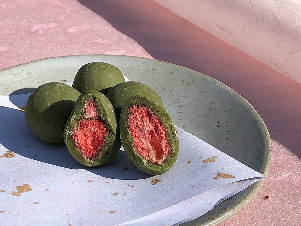 厳選された、ほどよい酸味のあるポーランド産のフリーズドライの苺に、丁寧に石臼で挽いた上薄茶用抹茶を使用した濃厚な抹茶チョコレートをコーティングしたトリュフです。