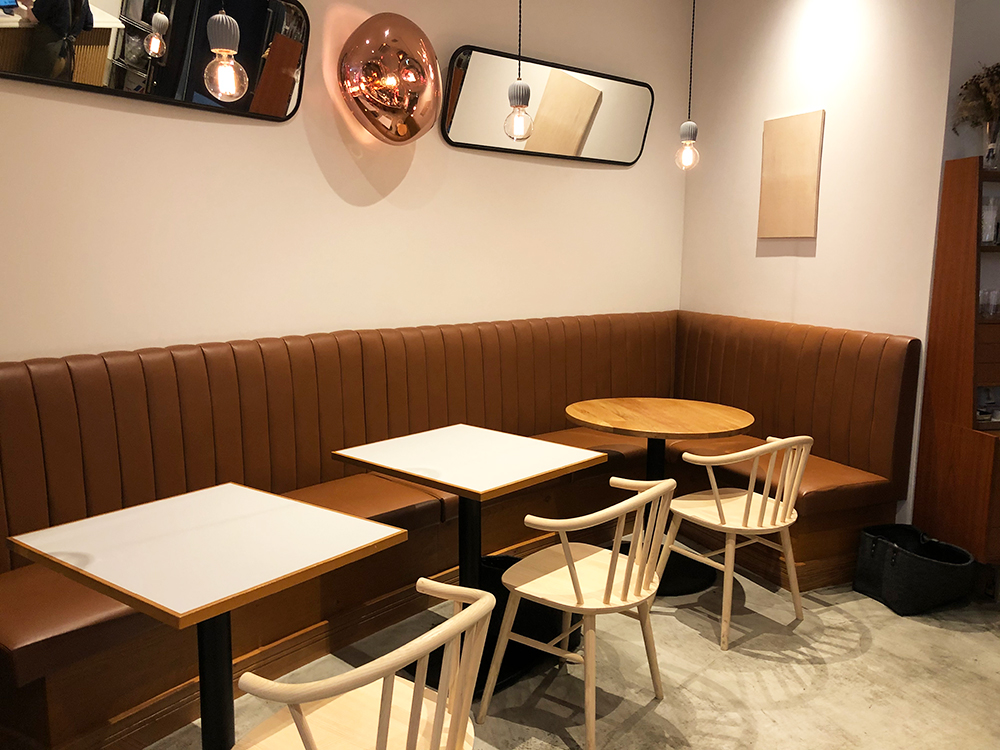 だからこそ、従来のフレンチのイメージとは違い、白×木目を基調とした温かみのある内装で気軽に立ち寄りやすい雰囲気に。キャメルのレザーソファやメタリックの照明などがアクセントになり、おしゃれで居心地のいい空間です。