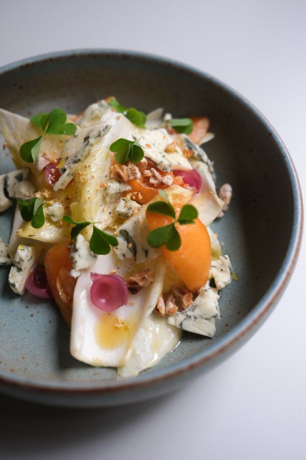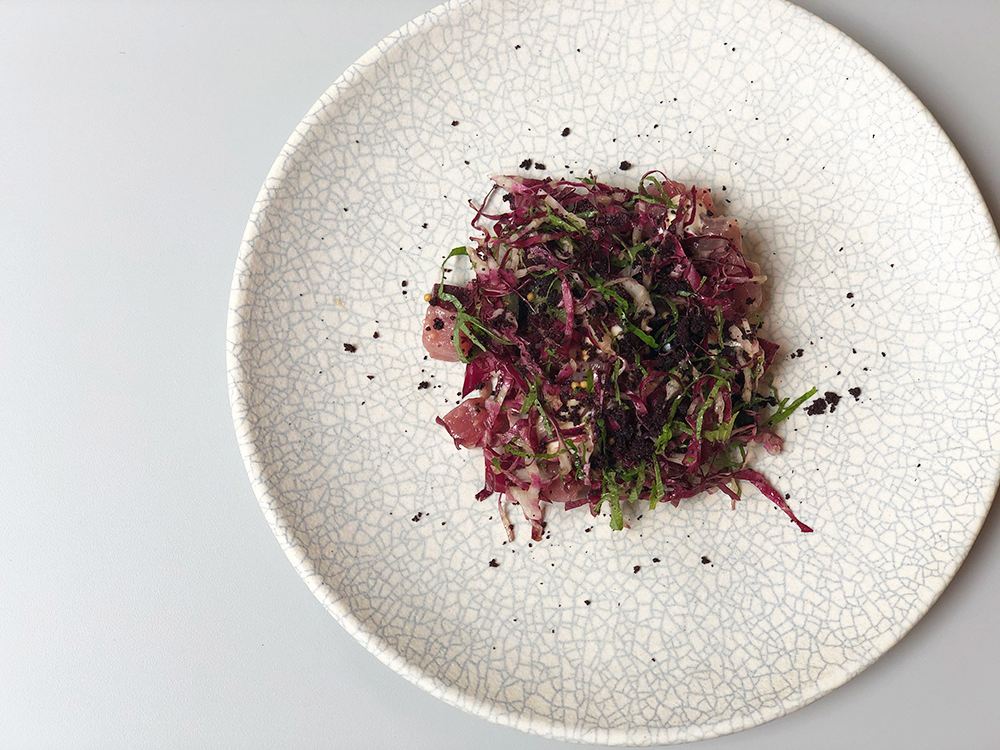 前菜は、サイコロ状にカットしたカツオと塩麹漬けのビーツ、発酵ブルーベリーの上に、千切りのシソ・トレビスをトッピングした一品。シソが使用されているうえ、カツオ節とマヨネーズを合わせたソースで味付けされているので、和の要素が織り交ぜられ親しみやすい味わいです。
