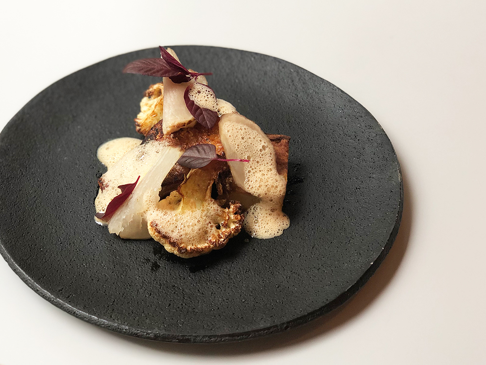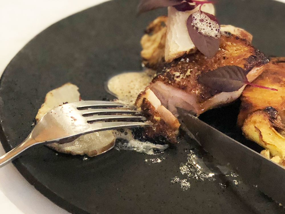 付け合わせには、ジャガイモを層にして中にアンチョビとチーズを仕込んだポムアンナやカリフラワーのロースト、漬物のような濃い味が特徴の発酵キクイモを。一見不思議な組み合わせに感じますが、見事にマッチしていておいしい!