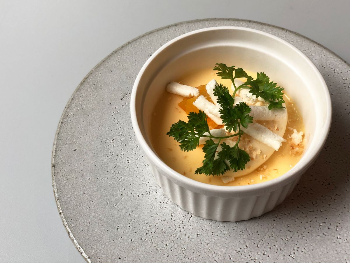 サクッとした食感のココナッツメレンゲや、いい香りが抜けていくカモミールのムース、ほんのり苦味のあるはっさくの皮が口の中で融合し、プリンの甘みとバランスを取ってくれます。