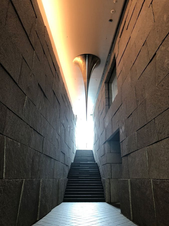 表参道駅A1出口の目の前にある、商業施設とオフィスの複合ビル「オーク表参道(オークオモテサンドウ)」内に店を構える「茶洒 金田中(さーしゃ かねたなか)」。大きなオブジェの下をくぐって、階段を上った先がその入口です。