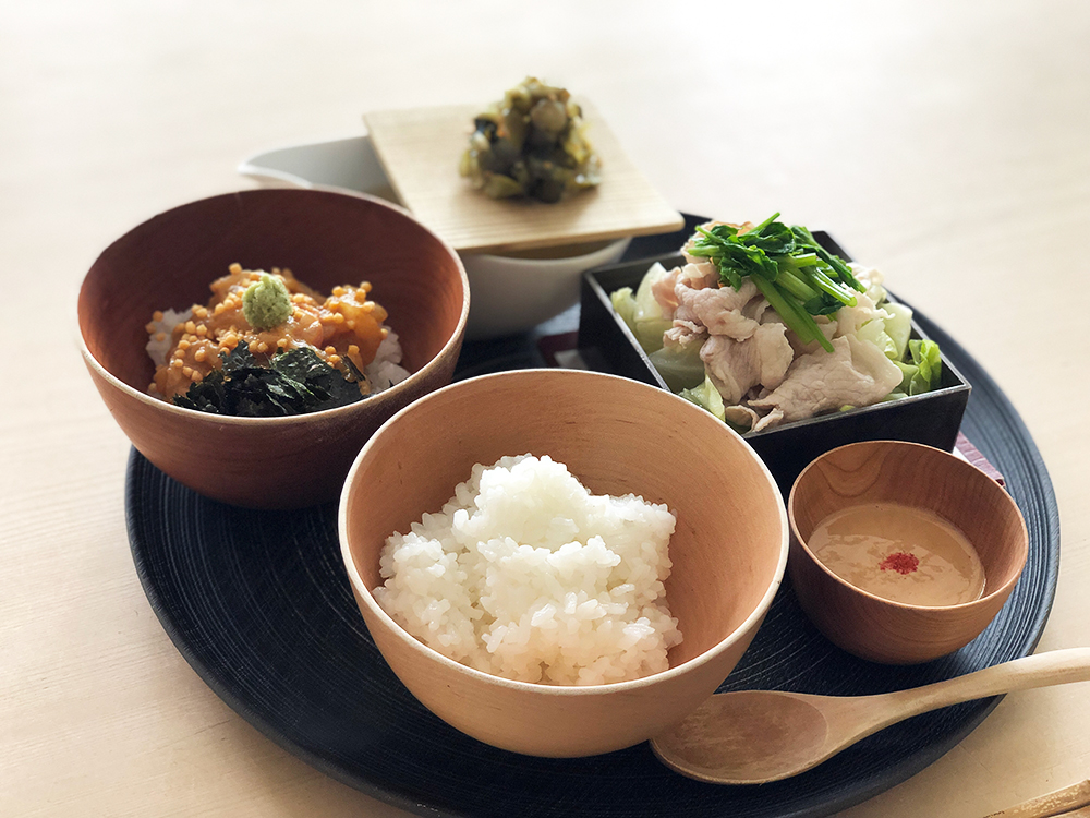 メイン料理はいろいろな味を楽しめるように、ハーフポーションのメニューを2つ選べるようになっています。木製のお茶碗や小鉢がお盆に乗って運ばれてくるので、わくわくが募ります。