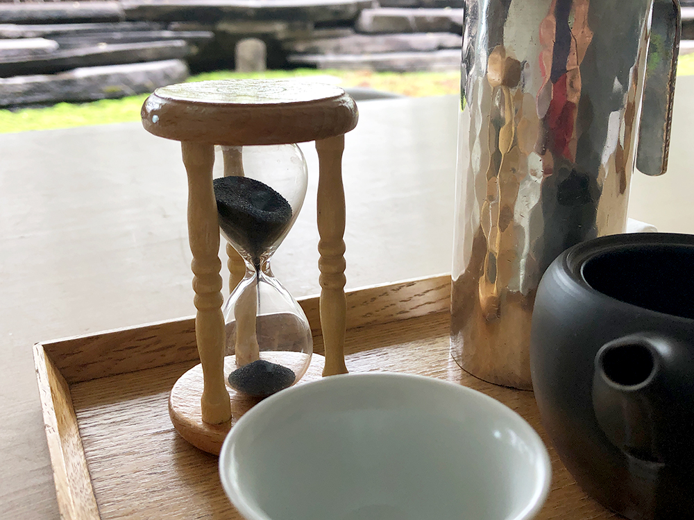二杯目以降は、自分でおちょこ一杯分のお湯を急須に注ぎ、砂時計で2分間を計って時間が経ったらいただきます。
