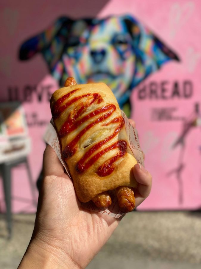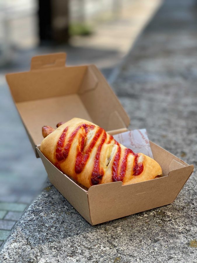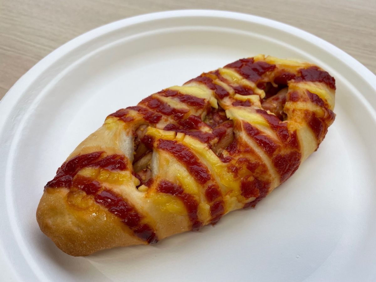 実食します!先ほどのスチパンに比べて、こちらは手に持ちやすいサイズ感ですね。表面にケチャップがギザギザとたっぷりかかっているので、手につかないように気をつけて食べましょう!さて、今回はわかりやすいように切ってみました。
