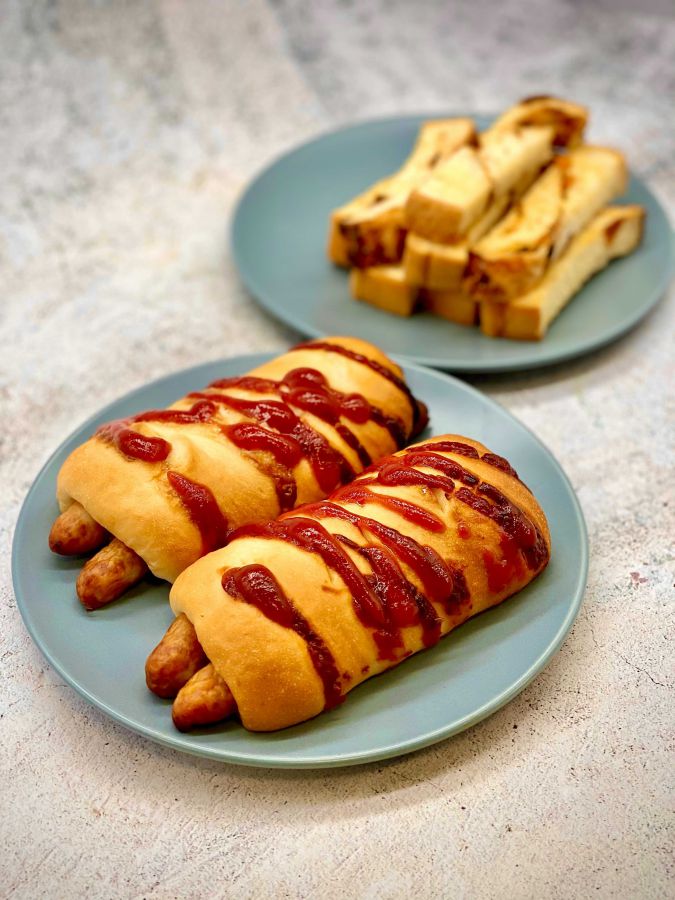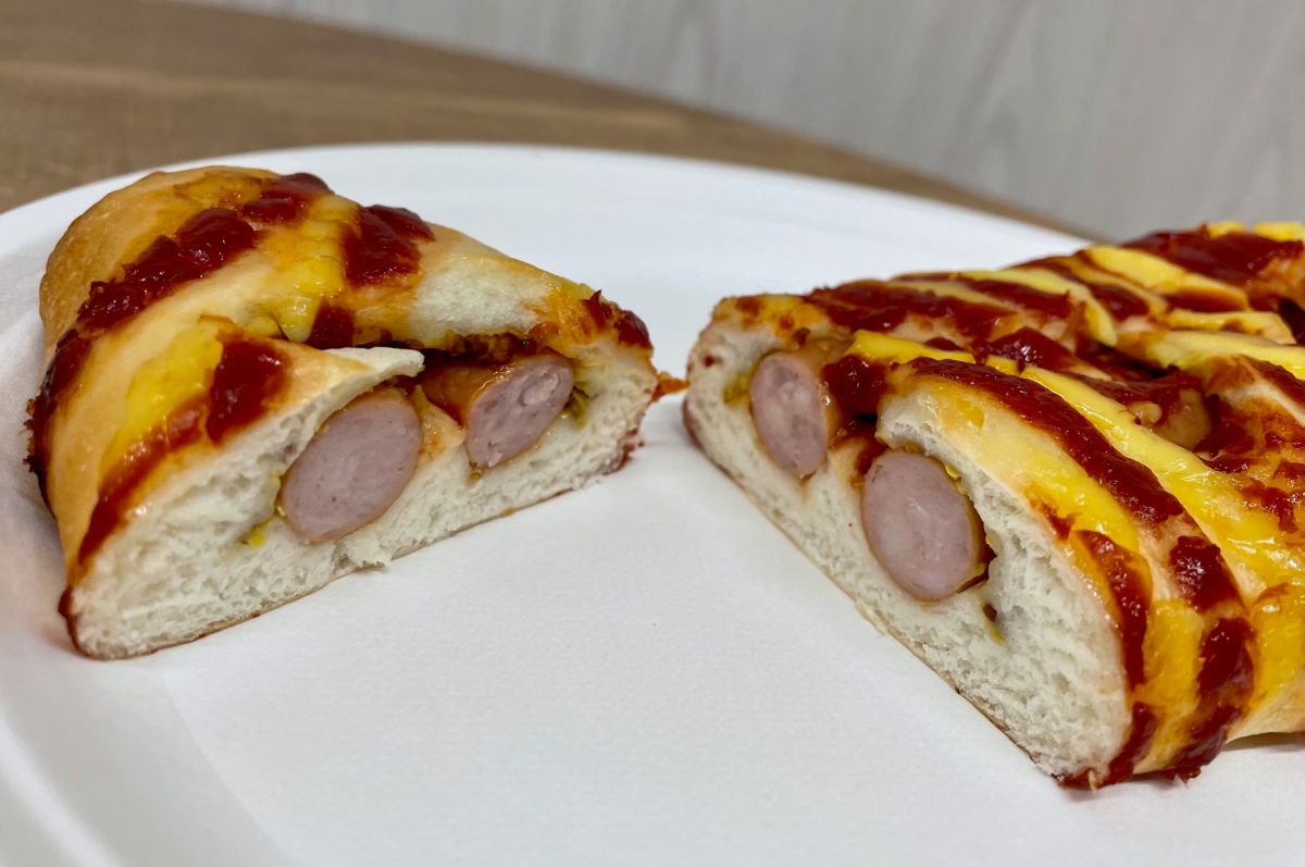 切ってみると、しっかりと2本のウインナーが登場!食べてみたら先端からウインナーがぎっしりと入っていて、ボリューム満点。お肉のジューシーな食感は満足感があるので、おなかが空いているときにもぴったりですよ。