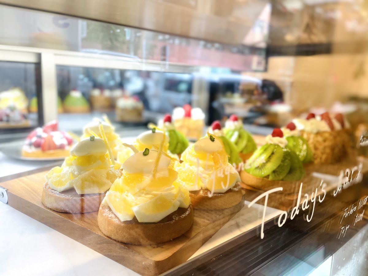 ショーケースをのぞくと、かわいらしいケーキがずらり♪ 今回お目当ての「ナポレオンパイ」のほかにも、いちごや日向夏、キウイなどフルーツを使ったさまざまなタルトも。