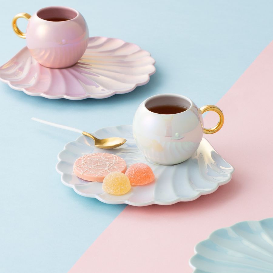 おうちカフェも手軽に夏仕様にチェンジしたい人には、プレートを貝殻に、マグをパールに見立てた映える「マグ&プレートセット」。