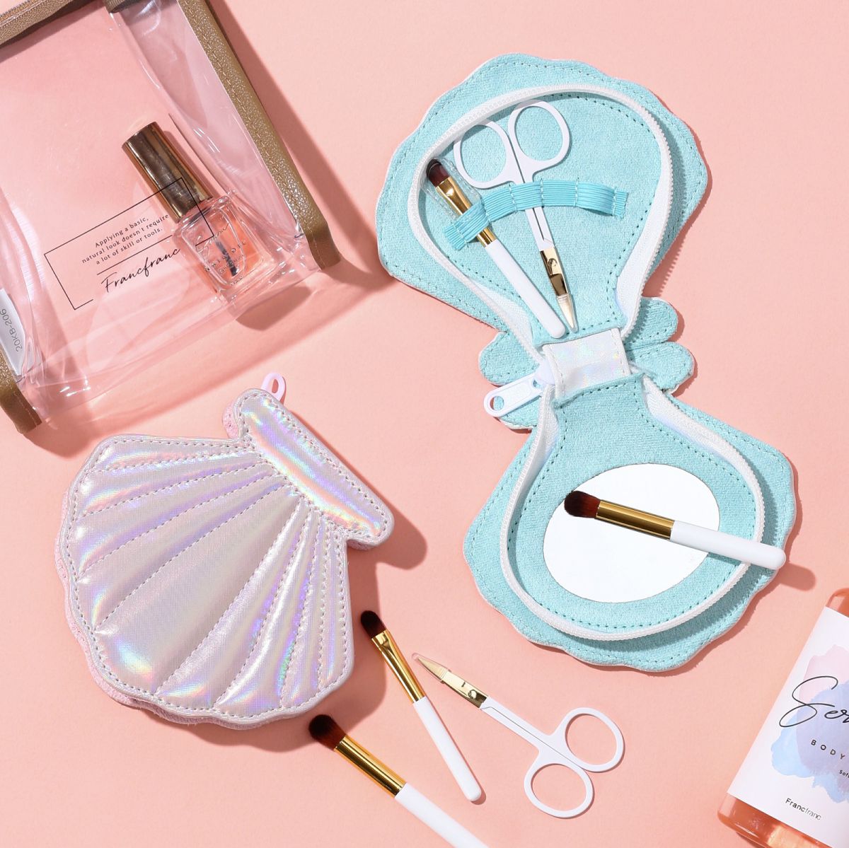 かわいらしい貝殻モチーフのポーチに、メイク直しに必要なケアアイテムミニブラシ2本とミニハサミ1本をセットした「シェルポーチ&メイクアップツールセット」は、ホワイトとピンクが各2000円。ポーチにはマチがあるので、アイシャドウやアイブロウなどミニコスメを入る優れもの。ミニバッグにも入れやすいサイズ感で、かわいくて持ち運びにも便利です。